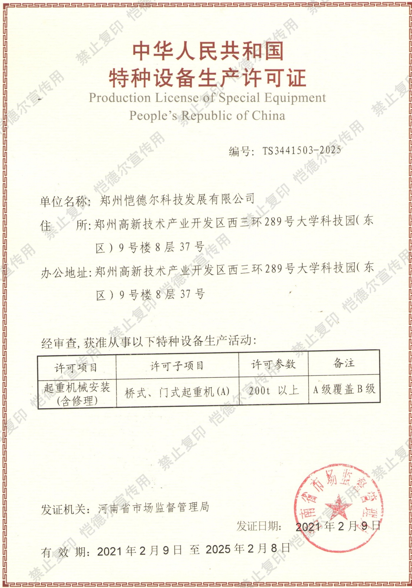 祝賀鄭州愷德爾科技發展有限公司取得起重機機械安裝(含維修)A級資質